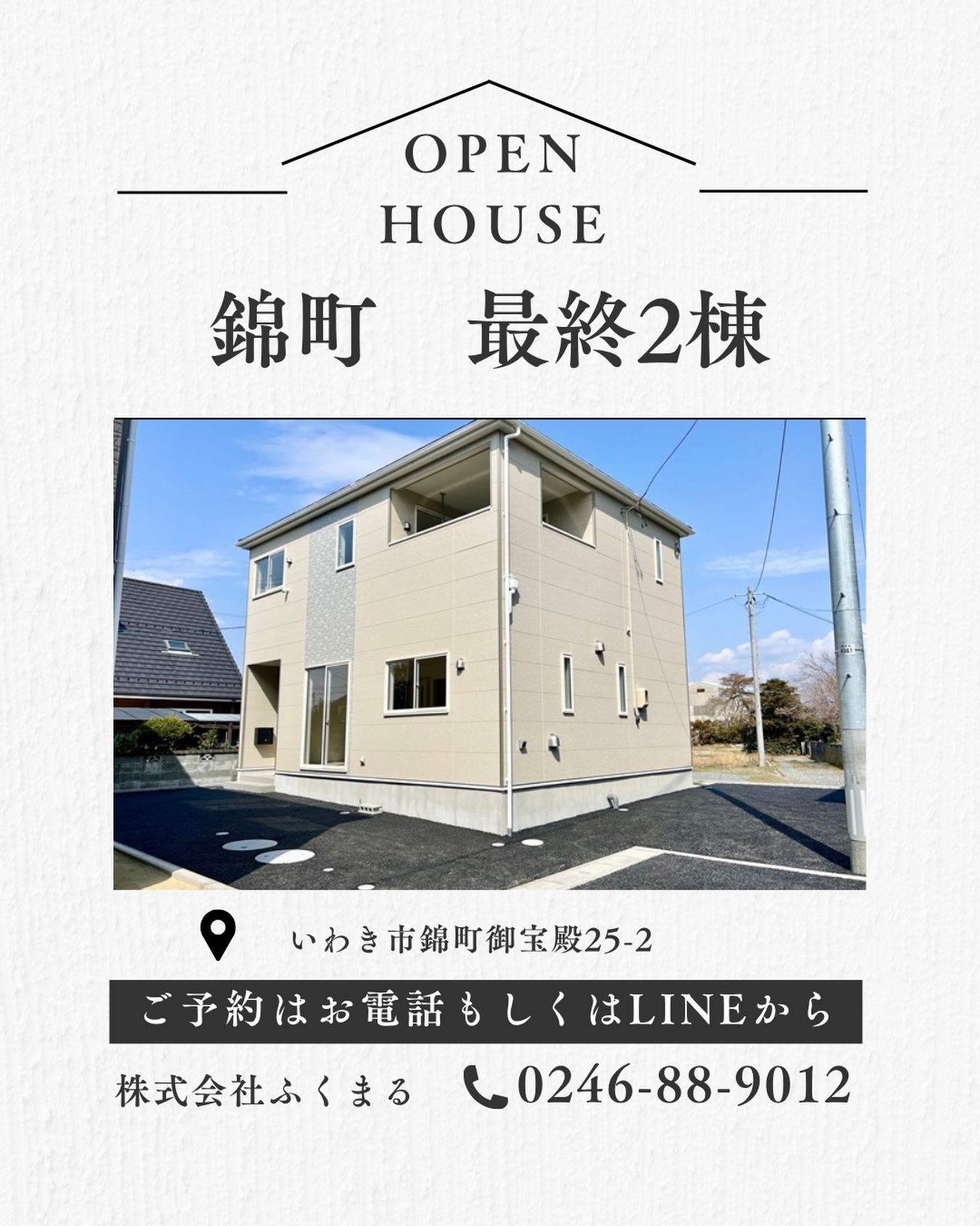 《オープンハウス情報》いわき市錦町、最終2棟の新築建売物件です🏠参加無料、予約も簡単🎉お子様連れ大歓迎です!!お休みの空い...