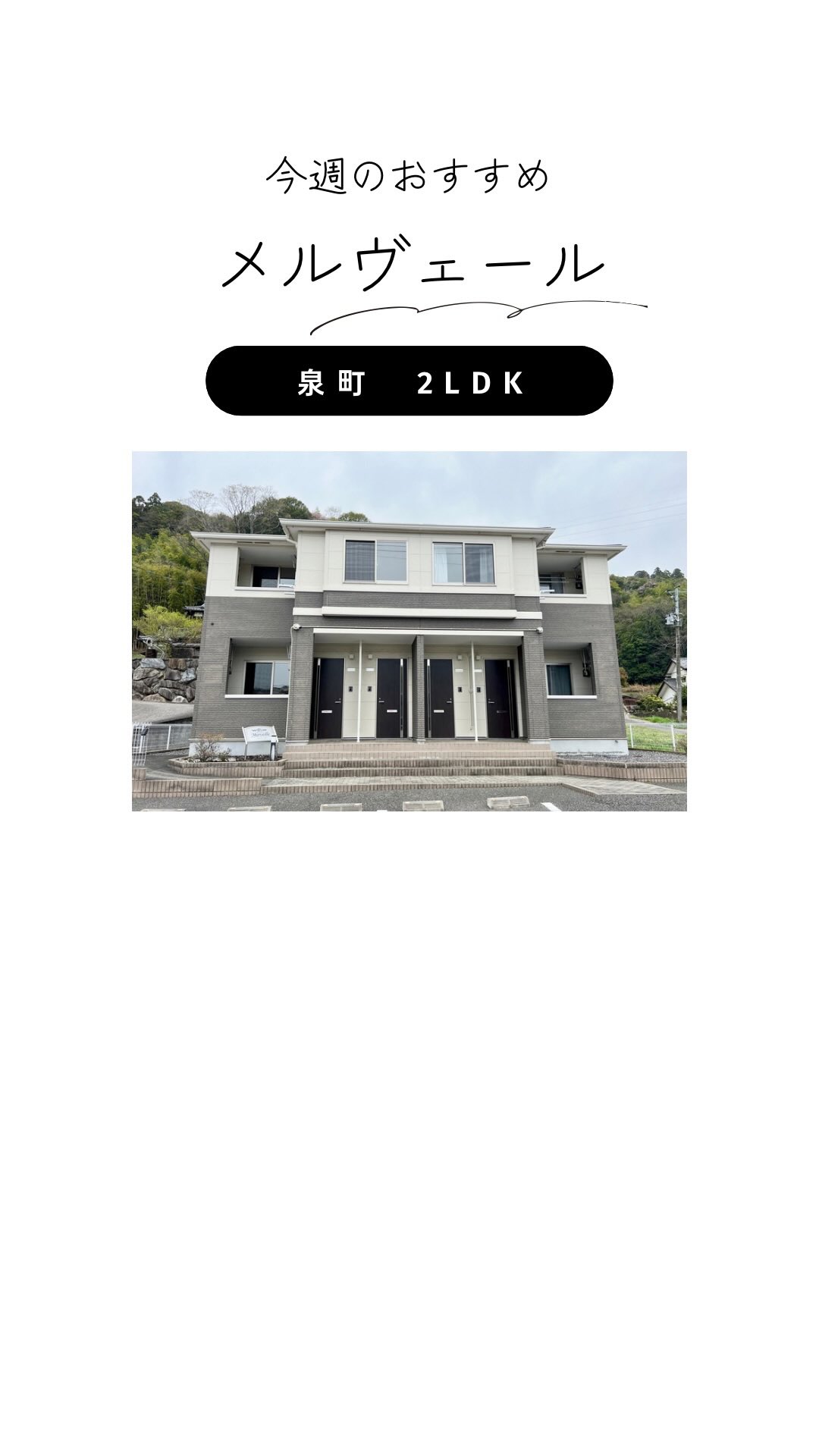 ✨今週のオススメ物件✨✅メルヴェール✅泉町エリア✅賃料61,000円《おすすめポイント》✳️エアコン2台✳️敷金礼金0円✳️2階角部屋...
